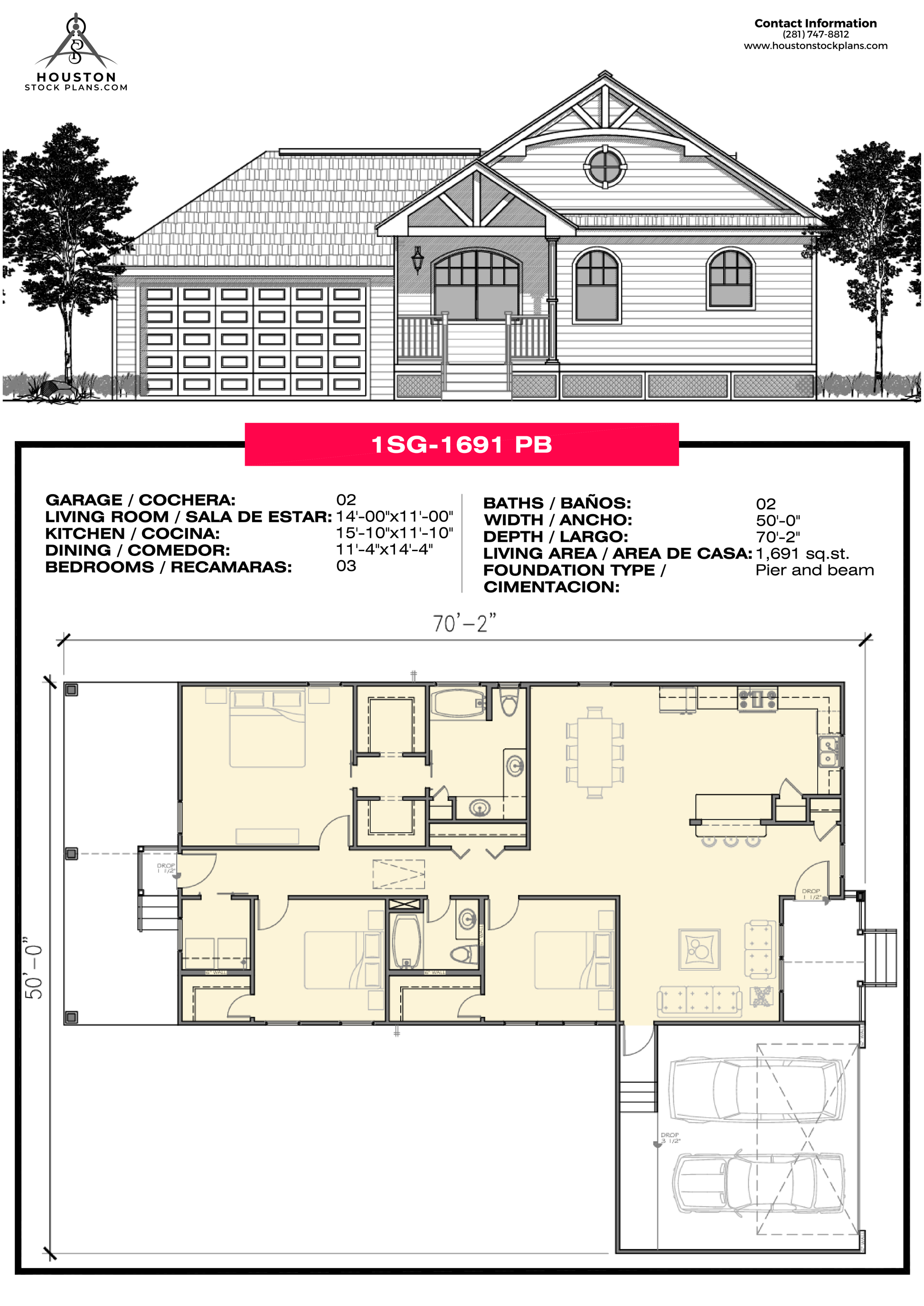 2 Car 14'—0" x 11'—0" 15'—10" x 11'—10" 11'—4" x 14'—4" 03 02 50'—0" 70'— 2" 1,691 sq. ft Pier and beam |