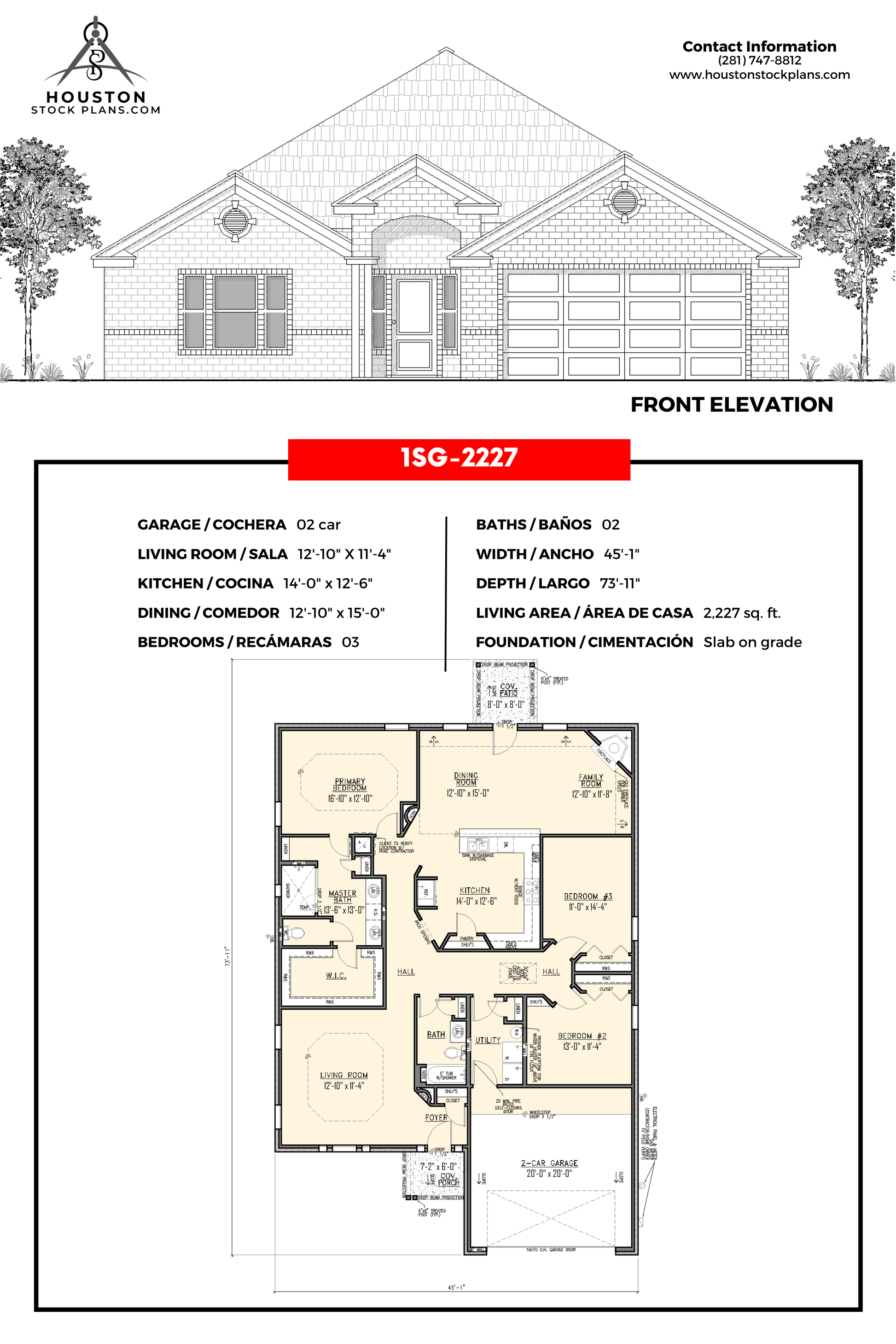 2 car 12'—10" x 11'—4" 14'—0" x 12'—6" 12'—10" x 15'—0" 03 2.5 45'—1" 73'—11" 2,227 Sq. ft Slab on Grade |