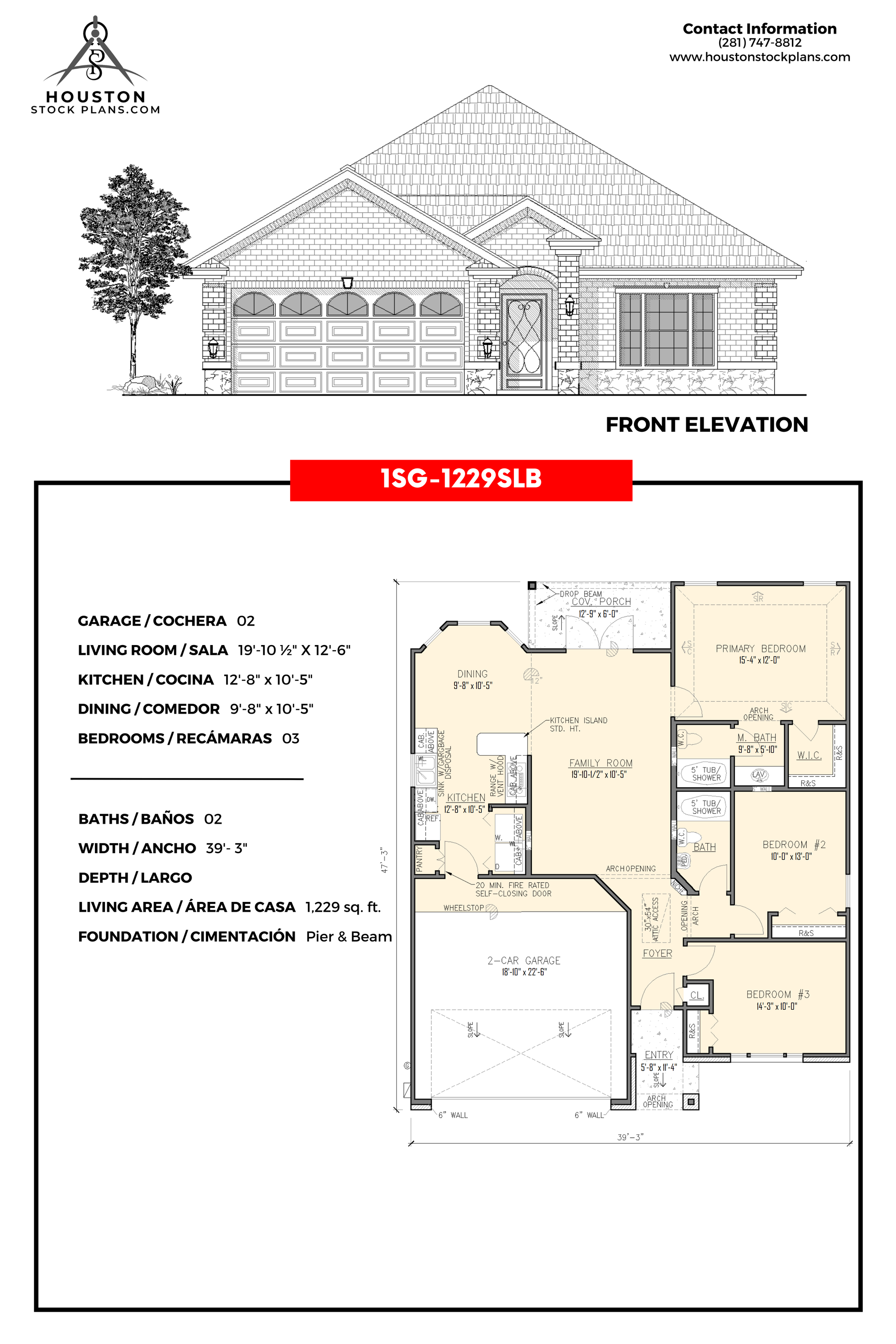 2 Autos 12'—6" x 19'—8" 10'—0" x 12'—8" 03 01 39'—3" 47'—3" 1,225 pies cuadrados Losa sobre suelo |