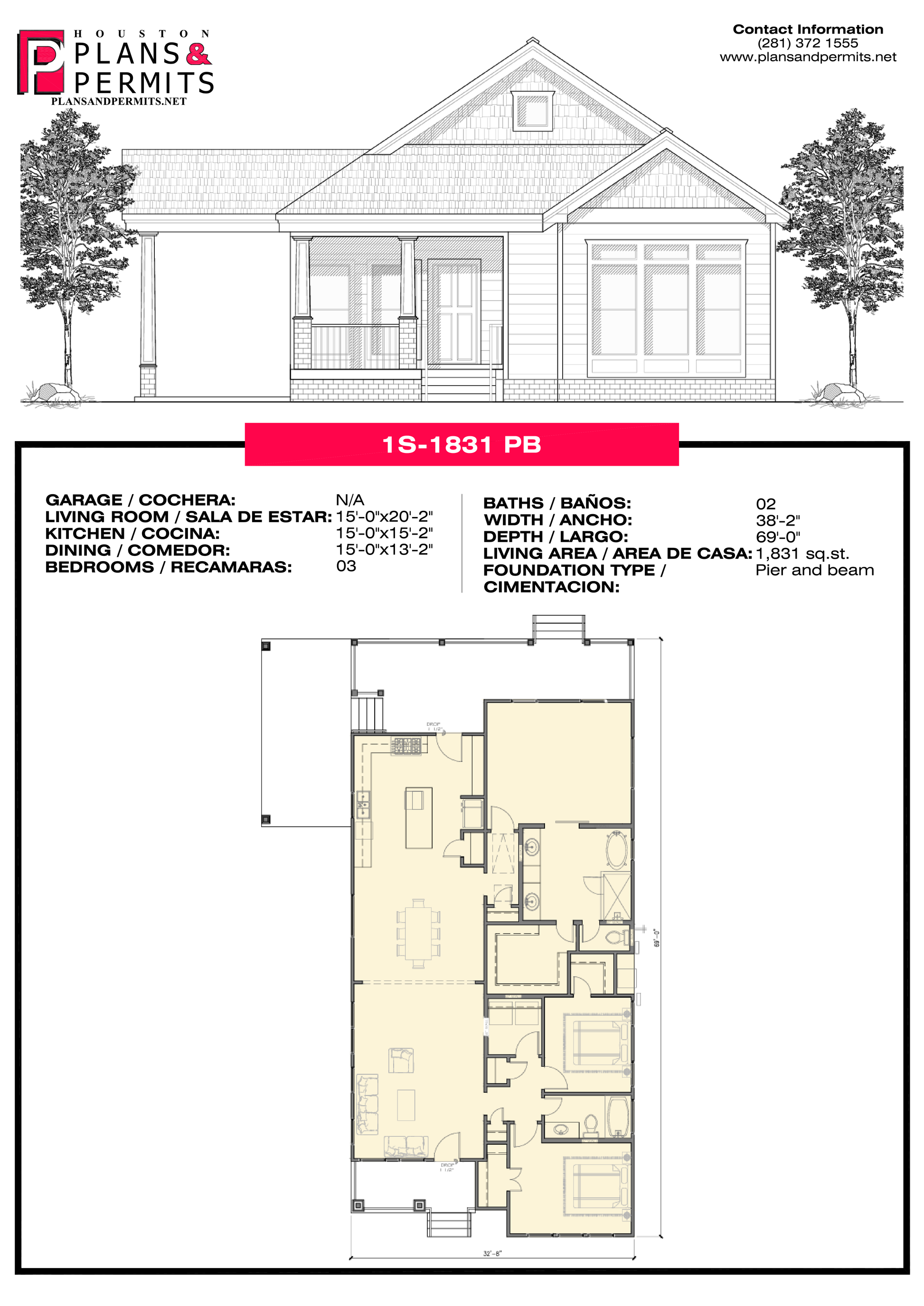 N/A 15'—0" x 20'—2" 15'—0" x 15'—2" 15'—0" x 13'—2" 03 02 38'—0" 69'— 0" 1,831 sq. ft Pier and beam |