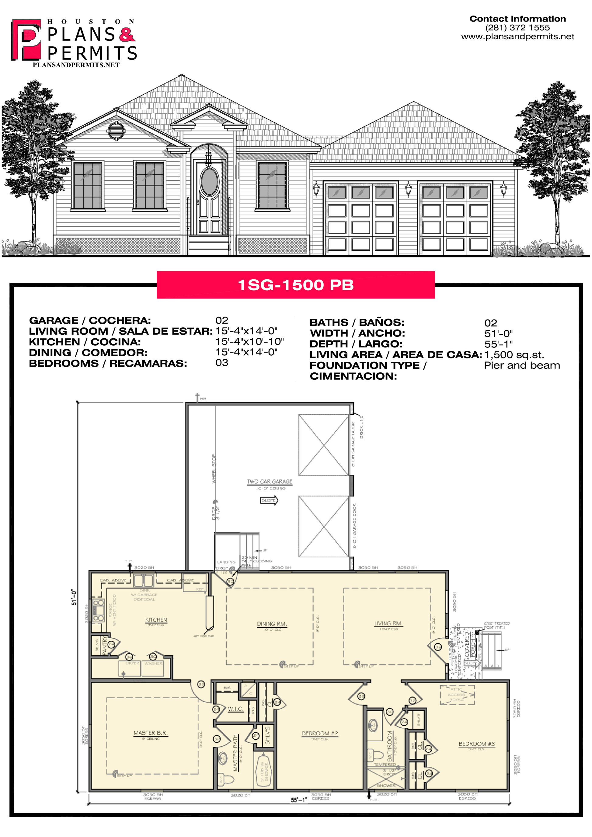 2 car 15'—4" x 14'—0" 15'—4" x 10'—10" 15'—4" x 14'—0" 03 02 51'—0" 55'—1" 1,500 Sq. ft Pier and beam |