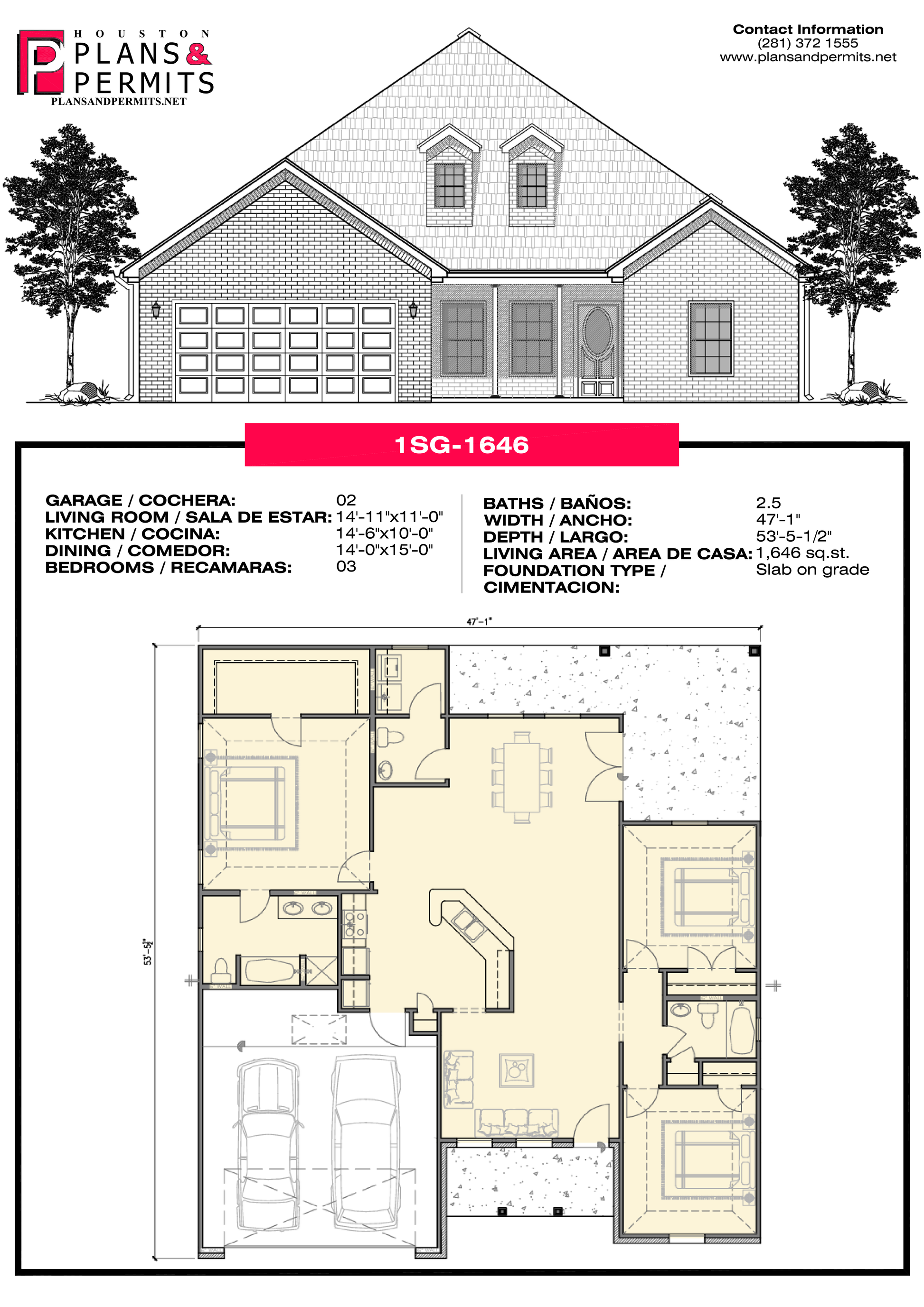 2 Car 14'—11" x 11'—0" 14'—6" x 10'—0" 14'—0" x 15'—0" 03 2.5 47'—1" 53'— 5-1/2" 1,646 sq. ft Slab on grade |