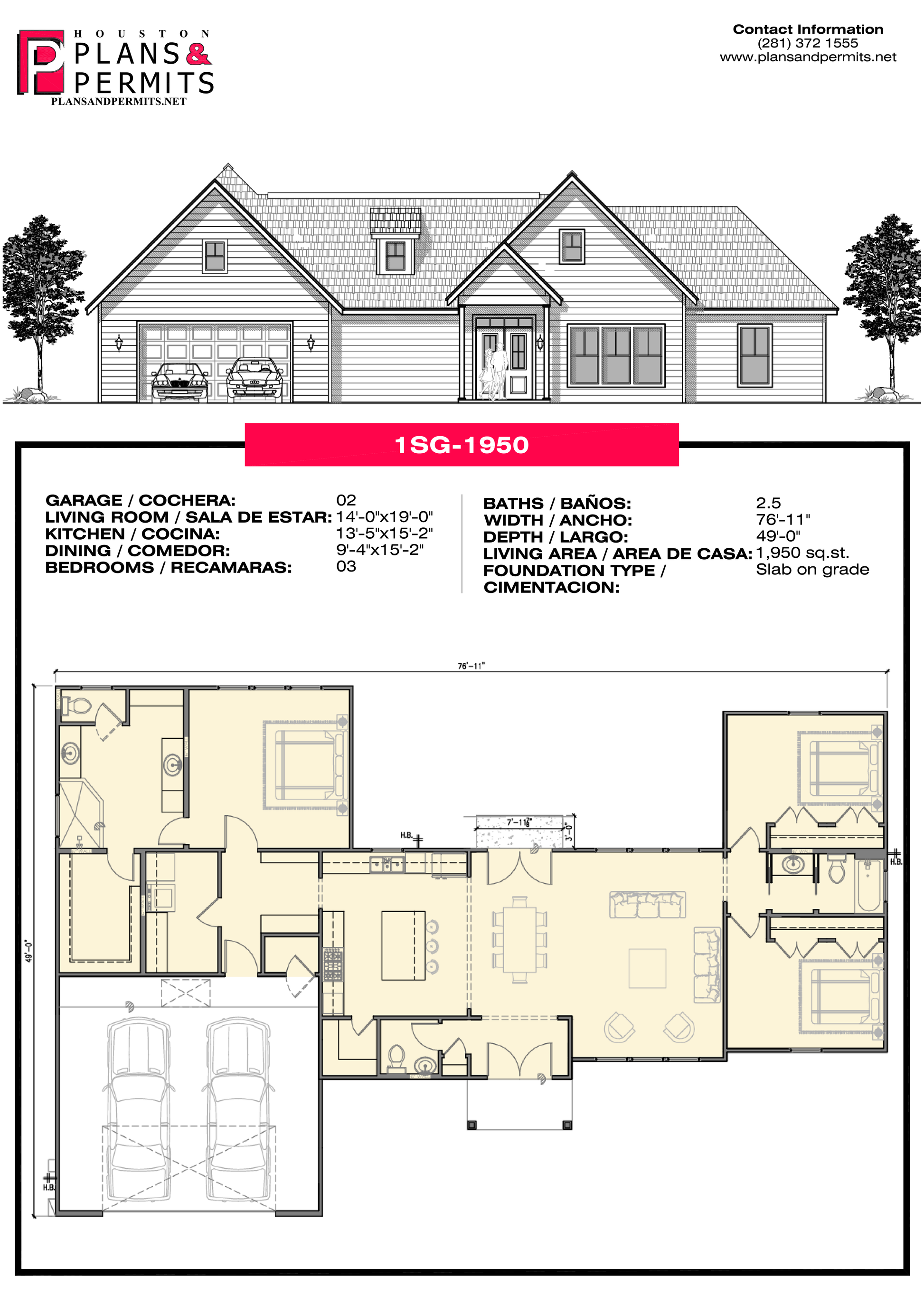 02 14'—0 " x 19'—0" 13'—5" x 15'—2" 9'—4" x 15'—2" 03 2.5 76'—11" 49'— 0" 1,950 sq. ft Slab on grade |