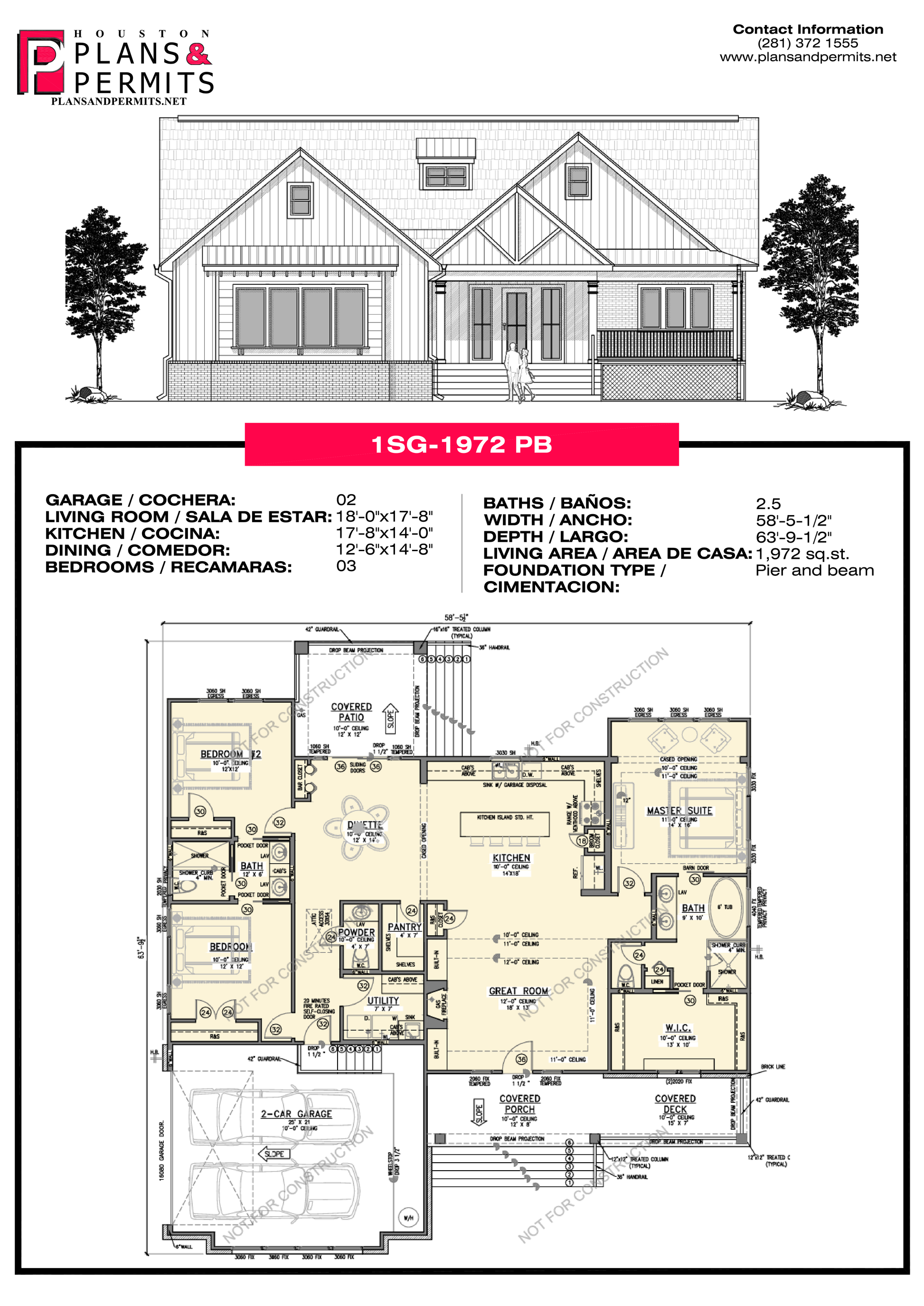 2 Car 18'—0" x 17'—8" 17'—8" x 14'—0" 12'—6" x 14'—8" 03 2.5 58'—5 1/2" 63'— 9 1/2" 1,972 sq. ft Pier and beam |